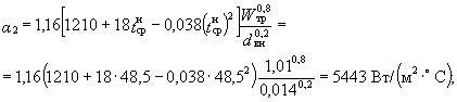 где a2 - коэффициент теплоотдачи при продольном смывании от стенки трубки к нагреваемой воде, Вт/(м2×°С); aп - коэффициент теплоотдачи от конденсирующегося пара к горизонтальной стенке трубки, Вт/(м2×°С); dст - толщина стенки трубки, м; dнак - толщина накипи, м, принимаемая на основании эксплуатационных данных для конкретного района с учетом качества воды, а при отсутствии данных допускается принимать равной 0,0005 м; lст - теплопроводность стенки трубки, Вт/(м×°С), принимается для стали равной 58 Вт/(м×°С), для латуни - 105 Вт/(м×°С); lнак - то же, слоя накипи, принимается равной 2,3 Вт/(м×°С). 4. Коэффициент теплоотдачи a2, Вт/(м2×°С), от стенки трубки к нагреваемой воде в области турбулентного движения, определяется по формуле