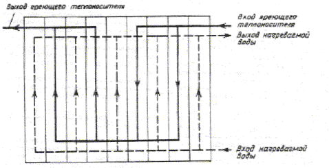 12. В соответствии с п. 1 настоящего приложения определяем необходимое сечение трубок водоподогревателя при скорости воды в трубках Wтр = 1 м/с и двухпоточной схеме включения