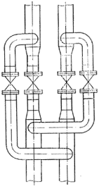 9.4. На водоводах, состоящих из двух ниток, следует применять узлы переключения по перекрестной схеме (рис. 31).
