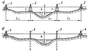 а - переход через реку на железобетонных опорах; б - переход через реку на свайных опорах; 1 - опоры из железобетонных колец; 2 - подвесные опоры; 3 - сварные опоры; 4 - подвесные опоры