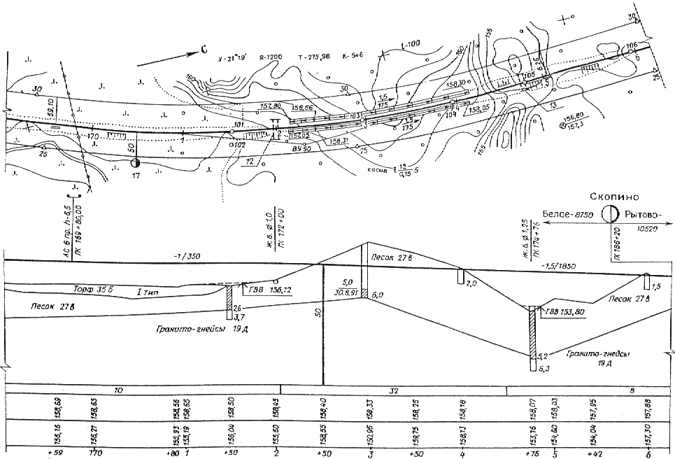Выше проектной линии наносят и указывают: - обозначения раздельных пунктов, их наименования и расстояния между ними; - обозначения проектируемых искусственных сооружений и их привязку к пикетам; - проектные уклоны и расстояния; - обозначения реперов, инженерных надземных сетей, переездов (примыканий - для реконструируемых железнодорожных путей); - рабочие отметки насыпи (при необходимости). Ниже проектной линии наносят: - линии ординат от точек переломов проектной линии; - подземные инженерные коммуникации; - условные обозначения проектируемых и существующих искусственных сооружений; - пикеты; - фактические отметки земли и проектные отметки бровки земляного полотна; - рабочие отметки выемки (при необходимости); - тип поперечного профиля; - неправильные пикеты, отметки головки рельса существующего и проектируемого пути, план левого и правого пути, указатели километров (при реконструкции железнодорожного пути). 6.4. При отходе проектируемого железнодорожного пути от существующей станции проектную линию в месте перехода от отметки головки рельса к бровке земляного полотна изображают ступенькой. 6.5. При большом числе плюсовых точек между отдельными пикетами на листе продольного профиля помещают таблицу по форме 10.