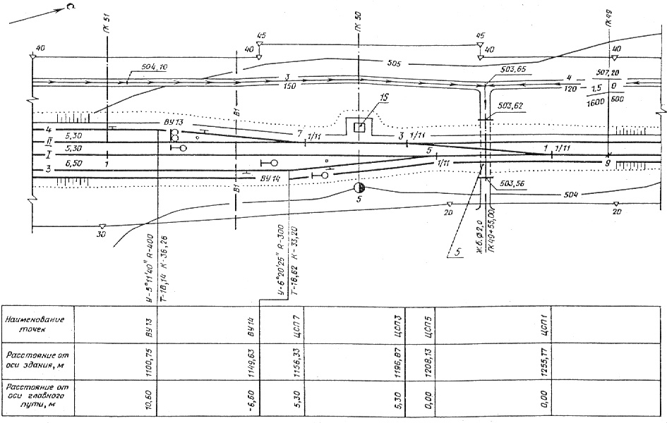 5.2.3. На планах железнодорожных путей на застроенной территории путевое оборудование изображают контурными линиями и обозначают маркой «ПО» с добавлением порядкового номера в пределах марки. Пример - ПО1, ПО2. Обозначение (марку) оборудования проставляют внутри контура или на полке линии-выноски. 5.2.4. На плане железнодорожных путей на застроенной территории дополнительно к 5.1.1 наносят и указывают: - строительную геодезическую сетку; - проектные горизонтали через 0,10 - 0,20 м или проектные отметки в характерных точках рельефа - в соответствии с планом организации рельефа; - номера железнодорожных путей; - расстояния между осями путей, а при необходимости, расстояния между осями путей и зданиями (сооружениями); - центры стрелочных переводов, их номера и привязку к пикетам (или координаты); - уклоноуказатели; - путевые упоры, их позиционные обозначения (марки) и обозначения чертежей на их устройство; - путевое оборудование и его позиционное обозначение (марку); - откосы насыпей и выемок (на не спланированной территории); - здания, сооружения, их номера или наименования (по разбивочному плану основного комплекта рабочих чертежей марки ГП) с привязкой к строительной геодезической сетке в соответствии с ГОСТ 21.508 (5.7, а); - координаты точек (например, вершин углов поворота, центров стрелочных переводов). При этом ситуацию местности наносят, как правило, за пределами ограждения или условной границы застроенной территории, а пересекаемые существующие железнодорожные пути, автомобильные дороги и инженерные коммуникации не привязывают к пикетам. 5.2.5. При насыщенном изображениями плане допускается обозначения координируемых точек и числовые значения элементов плана путей приводить в ведомости элементов плана путей. В этом случае на плане указывают только числовые значения углов поворота и радиусов. Ведомость элементов плана железнодорожных путей выполняют по форме 2. В графах ведомости указывают: - в графе «Обозначение точки» — обозначение координируемой точки (например, ЦСП5, ВУ13); - в графах «Координата точки»: А — координата точки по горизонтальной оси строительной геодезической сетки, Б — по вертикальной оси. Остальные графы заполняют в соответствии с их наименованиями. 5.2.6. На плане путей на застроенной территории для раздельных пунктов дополнительно к строительной геодезической сетке допускается применять станционную систему координат. Оси координат станционной системы должны быть привязаны к строительной геодезической сетке, а при ее отсутствии — к сети местной полигонометрии. 5.3 Планы путевого развития раздельных пунктовстолбики без привязки к пикетам; - координаты точек (вершин углов поворота путей, центров стрелочных переводов); - здания, сооружения, их номера 5.3.1. В качестве осей координат станционной системы принимают ось пассажирского или другого станционного здания, проведенную под углом 90° к главному пути, и ось главного пути, а при реконструкции — базис, совпадающий с осью главного пути или параллельный ей. За начало отсчета координат станционной системы принимают, как правило, точку пересечения указанных осей. 5.3.2. Изображение плана путевого развития раздельного пункта допускается делить на несколько участков, размещая их на отдельных листах. В этом случае на каждом листе плана, где показан участок плана, приводят схе