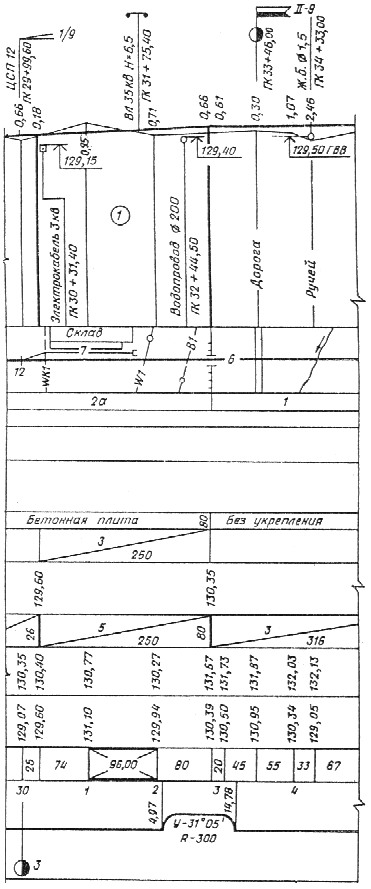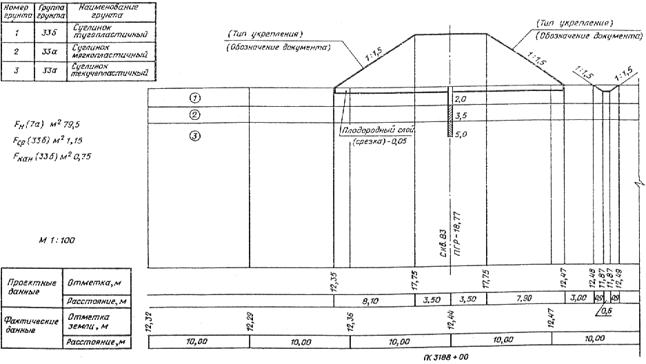 При размещении на листе двух поперечных профилей и более боковик таблицы допускается выполнять только у первого поперечного профиля. 8.2 Поперечные профили железнодорожных путей выполняют по направлению возрастания указателей километров, а для путей на застроенной территории (при отсутствии этих указателей) - в сторону возрастания пикетов. 8.3. На поперечном профиле земляного полотна железнодорожного пути показывают: - линию фактической поверхности земли, линии ординат от точек ее переломов и расстояния между ними; - контур проектируемого земляного полотна и линии ординат от точек его переломов, крутизну откосов. При реконструкции, кроме того, указывают контуры существующего земляного полотна и балластной призмы; - ось и отметку головки рельса проектируемого пути (ПГР). При реконструкции, кроме того, указывают оси и номера существующих путей, отметки головки рельса существующих путей (СГР) (номера разбираемых путей и отметки СГР указывают в скобках), расстояния между осями путей (расстояния между осями разбираемых и новых путей указывают в скобках); - проектные отметки земляного полотна и отметки земли в точках перелома; - разведочные геологические выработки (при их наличии), влажность и консистенцию слоев грунта, отметки горизонта высоких вод с датой замера; - границы слоев грунта, их наименования и номера групп в соответствии с классификацией по трудности разработки. Допускается наименования слоев грунта и номера их групп приводить в ведомости грунтов по форме 9; - контуры срезки плодородного или растительного слоя, удаления торфа и замены непригодного грунта; - крутизну откосов; - элементы укрепления откосов земляного полотна и водоотводных сооружений (схематично), их марки (наименования) и обозначения документации, необходимой для выполнения укрепления.