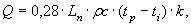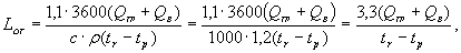 где Gi - расход инфильтрующегося воздуха, кг/ч, через ограждающие конструкции помещения, определяемый в соответствии с п. 3 настоящего приложения; с - удельная теплоемкость воздуха, равная 1 кДж/(кг×°С); tp, ti - расчетные температуры воздуха, °С, соответственно в помещении (средняя с учетом повышения для помещений высотой более 4 м) и наружного воздуха в холодный период года (параметры Б); k - коэффициент учета влияния встречного теплового потока в конструкциях, равный 0,7 для стыков панелей стен и окон с тройными переплетами, 0,8 - для окон и балконных дверей с раздельными переплетами и 1,0 – для одинарных окон, окон и балконных дверей со спаренными переплетами и открытых проемов. 2. Расход теплоты Q, Вт, на нагревание инфильтрующегося воздуха в помещениях жилых и общественных зданий при естественной вытяжной вентиляции, не компенсируемого подогретым приточным воздухом, следует принимать равным приточным воздухом, следует принимать равным большей из величин, полученных по расчету по формулам (1) и (2):
