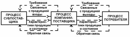 Рисунок 2 - Взаимосвязь процессов (с потоками продукции и информацией) в цепочке поставки Рисунок 2 иллюстрирует отношения поставщика с субпоставщиком и потребителем в цепочке поставки. В этой структуре цепочки поставки разные входы и выходы должны быть в различных направлениях. В данном контексте понятие "продукция" включает в себя все четыре общие категории продукции. Общее руководство качеством достигается через управление процессами в организации. Процессом необходимо управлять по двум направлениям: - через структуру и работу самого процесса, внутри которого имеются потоки продукции или информации; - через качество продукции или информации, протекающих внутри структуры. 4.7. Сеть процессов в организации Каждая организация выполняет работу посредством сети процессов. Структура этой сети, как правило, довольно сложная. Любая организация - многофункциональная. К функциям относятся: производство, проектирование продукции, управление технологией, маркетинг, подготовка кадров, руководство трудовыми ресурсами, стратегическое планирование, поставка, выписка счетов, техническое обслуживание и ремонт. Важно выделить основные процессы, упростить и расставить их в зависимости от приоритетов с целью общего руководства качеством. Организации необходимо определить, организовать и управлять своей сетью процессов и взаимодействием. Организация создает, улучшает и обеспечивает постоянное качество в своих предложениях с помощью сети процессов. Процессы и их взаимодействие должны подвергаться анализу и непрерывному улучшению. Особенно сложно управлять несколькими процессами и их взаимосвязями, например крупными процессами, которые могут охватывать ряд функций. Для выяснения взаимодействия, ответственности и полномочий у каждого процесса должен быть владелец - лицо, несущее за него ответственность. Качество процессов, за которые ответственно исполнительное руководство, таких, как стратегическое планирование, является особенно важным. 4.8. Система качества применительно к сети процессов Система качества состоит из ряда элементов. Функционирует посредством процессов как внутри, так и во взаимодействии функций. Для эффективности системы качества эти процессы и соответствующие ответственность, полномочия, методики и ресурсы следует определить и развернуть на постоянной основе. В целях эффективности системы качества необходимы координация и совместимость составляющих ее процессов, а также определение их взаимодействия. 4.9. Оценка систем качества 4.9.1. Общие положения При оценке систем качества необходимо задавать следующие три основные вопроса к каждому оцениваемому процессу: а) Определены ли процессы и, соответственно, оформлены ли документально их методики? b) Полностью ли развернуты и внедрены процессы согласно документации? с) Являются ли процессы эффективными для достижения ожидаемых результатов? Совокупные ответы на эти вопросы, относящиеся, соответственно, к подходу, развертыванию и результатам, будут определять выходные данные оценки. Оценка системы качества охватывает широкий диапазон деятельности, некоторые виды которой приведены в подразделах 4.9.2 и 4.9.3. 4.9.2. Анализ со стороны руководства Одним из видов деятельности исполнительного руководства организации-поставщика является оценка состояния и адеква