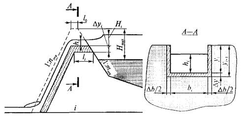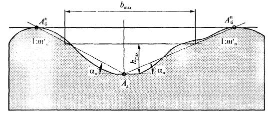 4.3. Определение скорости потока в сечении у подошвы откоса дамбы. Скорость u определяется по известному расходу и глубине потока в сечении у подошвы откоса: u1 = Qmax/(b1h01), u2 = qmax/h02. (47) Из полученных расчетов из двух случаев выбираем максимальные значения параметров потока в сечении у подошвы откоса: глубины hmax и скорости umax. Ширина потока в этом сечении принимается равной максимальной ширине прорана bmax. Эти величины являются исходными для расчета движения потока по прилегающей к хранилищу местности. V. РАСЧЕТ МАКСИМАЛЬНЫХ ПАРАМЕТРОВ ПОТОКА ПО ТРАССЕ РАСТЕКАНИЯВ зависимости от характера рельефа вытекающий из хранилища поток может быть ограничен боковыми склонами долины либо растекание может происходить нестесненным образом, если хранилище расположено на плоской местности или в широкой долине. Учитывая, что хранилища организаций, подконтрольных органам Госгортехнадзора России, в основном относятся к овражным, овражно-пойменным и (или) равнинным типам, принимается, что вытекающий поток ограничен постоянным значением боковых склонов ложбин, лога или слабонаклоненных поверхностей поймы или равнины. В расчете принято допущение, что лог по всей длине трассы растекания имеет треугольное сечение. Для определения параметров потока по трассе растекания русло потока разбивается на участки с постоянными уклонами дна и формой поперечного сечения. На границах участков принимается условие равенства расходов. За расчетное принимается максимальное значение расхода потока Qп = Qmax, полученное в результате расчета на первом этапе. Для расчета площади сечения лога на концах выбранных участков задаются характерные абсолютные отметки бортов Aб и дна Aд лога (рис. 2). Рис. 2. Поперечное сечение лога Для определения формул расчета скорости ui, глубины hi и ширины bi потока вычисляются уклоны i-х участков лога Iлi: Iлi = (Aдi-1 - Aдi)/Lлi, где Lлi - длина выбранного i-го участка лога. Для плоского рельефа местности и уклонов с Iлi < 0,01 параметры потока определяются: скорость потока глубина потока ширина потока где