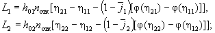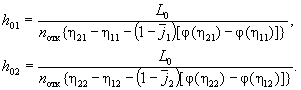 Полученные в уравнении (42) величины L1 и L2 сравниваются с длиной внешнего откоса дамбы L0. Если полученное значение L1 < L0 (L2 < L0), то считается, что глубина потока у подошвы откоса равна нормальной глубине h01 = h11 и h02 = h12. Если же значение L1 > L0 (L2 > L0), тогда, задавая L1 = L0 (L2 = L0), из уравнения (42) определяем глубину потока у подошвы откоса