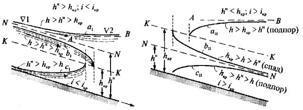 Так как коэффициент Шези C и гидравлический радиус R зависят от глубины hн, то hн определяется методом последовательных итераций. При этом C определяется по формуле (36), R определяется по формуле (35). В зависимости от соотношения глубин hi-1, hкр, hн и уклона будем иметь кривую спада либо подпора (рис. 3). Исходя из уравнения Бернулли