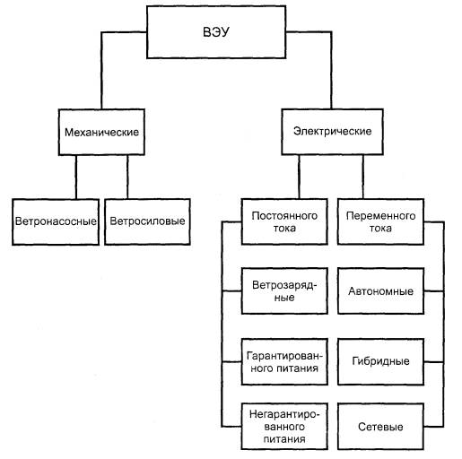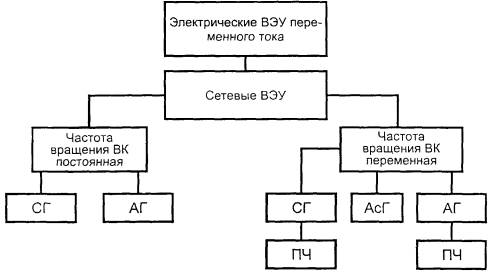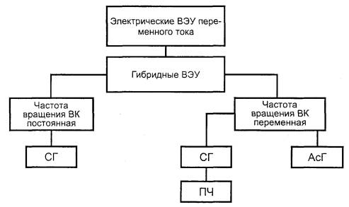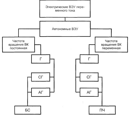 Общая схема классификации ВЭУ приведена на рисунке 1. Схемы классификации электрических ВЭУ переменного тока показаны на рисунках 2-4. Рисунок 1 - Общая классификация ВЭУ Рисунок 2 - Структурная схема автономных ВЭУ Г - генератор; СГ - синхронный генератор; АГ -