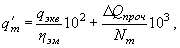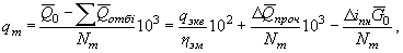 Для турбоагрегатов энергоблоков, имеющих турбоприводы механизмов собственных нужд (питательных насосов, воздуходувок и т.п.), работающих на паре отборов, удельный расход тепла на выработку электроэнергии qт {кДж/(кВт·ч)[ккал/(кВт·ч)]} рассчитывается по формуле где