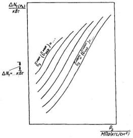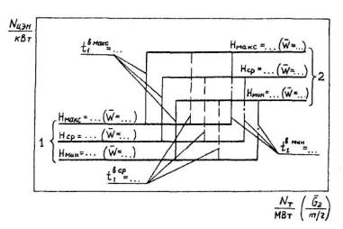Нормативная мощность при работе в режиме с полным использованием тепла отработавшего пара Условия: р2 = ... рп = ... t'псв1(∆tпсв) = ... (Для режима работы с двухступенчатым подогревом сетевой воды) Для турбоагрегатов типов ПТ1, ПТ2 Приводится в виде набора графиков для ряда значений