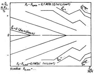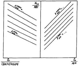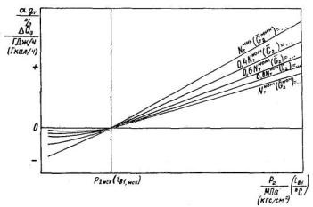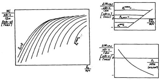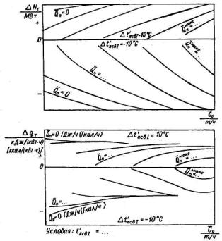 температурного напора (недогрева сетевой воды) в подогревателе зависимости от часового отпуска тепла сопротивления паропровода на участке от камеры отбора до подогревателя сетевой воды (для отопительного отбора) и до точки измерения давления в коллекторе пара (для производственного отбора) (рис. П4.42). 4.5.3.4. Для режима работы турбоагрегата типа П(Т1) с полным использованием тепла пара, поступающего в конденсатор, строятся графические зависимости следующих показателей: удельного расхода тепла от мощности турбоагрегата (рис. П4.43); нормативной мощности турбоагрегата от часового отпуска тепла из (производственного) отопительного отбора для ряда значений часового отпуска тепла отработавшего пара из конденсатора; для каждого из этих значений часового отпуска тепла указываются линии постоянных значений давления этого пара (рис. П4.44); характеристики конденсатора для значений часового расхода охлаждающей воды через него и ее температуры, которые характерны при работе в этом режиме (см. рис. П4.24). 4.5.3.5. Характеристика турбоприводов механизмов собственных нужд турбоагрегата энергоблока разрабатывается при их наличии в соответствии с п. 4.4.2.4 для установленных режимов работы турбоагрегата. 4.5.3.6. Поправки к основным и промежуточным показателям приводятся на отклонение значений внешних факторов и параметров, указанных в пп. 4.3.3.1 - 4.3.3.11, 4.3.3.13 - 4.3.3.15. (Измененная редакция, Изм. № 1). Разработка поправок производится в соответствии с п. 4.3. Характер графических зависимостей поправок от внешних факторов, показателей и параметров показан на рис. П4.1, П4.4 - П4.11, П4.13). 4.5.3.7. Поправки на отклонение значений внешних факторов определяются: к мощности турбоагрегата при работе в К - режиме - в соответствии с условиями, указанными в п. 4.4.4.2, в режиме П(Т1) - при условии сохранения неизменными исходных значений часового расхода свежего пара и тепла в регулируемый отбор; к удельному и часовому расходам тепла на выработку электроэнергии при работе по электрическому графику - при сохранении постоянными исходных значений мощности и часового расхода тепла в регулируемый отбор, при работе по тепловому графику - только часового расхода тепла в регулируемый отбор; к мощности при работе в режиме с полным использованием тепла отработавшего пара и нагревом в конденсаторе сетевой воды - на отклонение давления отработавшего пара (температуры обратной сетевой воды). (Измененная редакция, Изм. № 1). 4.5.3.8. Поправки к нормативному значению мощности турбоагрегата для режима работы с полным использованием тепла отработавшего пара приводятся на отклонение значений следующих внешних факторов: температуры свежего пара (см. рис. П4.1); давления пара в камере производственного (отопительного) отбора (см. рис. П4.13); давления отработавшего пара в конденсаторе (см. рис. П4.4); соотношения часовых расходов свежего пара и питательной воды (см. рис. П4.7); отпуска тепла из нерегулируемых отборов сверх нужд регенерации (см. рис. П4.10); старения оборудования. 4.5.4. Энергетические характеристики турбоагрегатов типа Т2 4.5.4.1. Энергетические характеристики турбоагрегатов типа Т2 с двухступенчатым отопительным отбором пара строятся для работы в режимах конденсационном (режим К), с включенными одной и двумя ступенями отопительного отбора (режимы T1 и Т2) и с полным использованием тепла отработавшего п