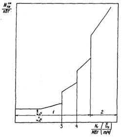 Удельный расход электроэнергии на питательные (бустерные) насосы (для энергоблоков) 1 - в работе 1 насос; 2 - в работе 2 насоса