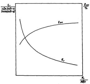(Измененная редакция, Изм. № 1). Кроме формул (8) и (9) могут быть использованы также формулы где Формулы (8), (9), (10), (11) действительны при условии равенства часовых расходов питательной воды через ПВД и свежего пара. Для линий максимальных граничных режимов при неизменных (максимальных) значениях часового расхода свежего пара (тепла) новые значения мощности Nт (МВт) определяются по формуле где Nт,0 - исходное значение электрической мощности турбоагрегата, МВт. Для теплофикационных турбоагрегатов с противодавлением или с конденсатором при работе в режиме с полным использованием тепла отработавшего пара при одном и том же исходном значении часовых расходов тепла из регулируемых отборов и противодавления новое значение электрической мощности определяется по формуле (12). 3.2.11. Корректировка значений удельной выработки электроэнергии по теплофикационному циклу производится при неизменных значениях часового расхода свежего пара по формуле, аналогичной формуле (12), в которую вместо значений мощности подставляются значения удельной выработки. При определении новых значений показателей по пп. 3.2.9 и 3.2.10 влияние старения для турбоагрегатов всех типов рассчитывается по формуле (3) с коэффициентом износа, равным 0,0085. 4. ЭНЕРГЕТИЧЕСКИЕ ХАРАКТЕРИСТИКИ ТУРБОАГРЕГАТОВ4.1. Определение удельного расхода тепла на выработку электроэнергии Удельный расход тепла турбоагрегатом на выработку электроэнергии qт {кДж/(кВт·ч)[ккал/(кВт·ч)]} определяется по формуле где