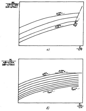 турбоагрегата (кроме турбоприводов механизмов) 4.4.2.2. Вместо графика зависимости часового расхода отработавшего пара в конденсатор турбоагрегата от часового расхода свежего пара энергетические характеристики турбоагрегата могут содержать графики других зависимостей, дающие возможность определять часовой расход пара в конденсатор для данного режима работы турбоагрегата более точно и объективно. 4.4.2.3. Графики зависимости давления отработавшего пара и температурного напора в конденсаторе от часового расхода отработавшего пара при различных значениях температуры охлаждающей воды на входе в конденсатор строятся для таких постоянных значений ее часового расхода, которые позволяют путем интерполирования определять значения давления во всем рабочем диапазоне нагрузок. 4.4.2.4. Графики зависимости часового расхода пара на турбоприводы механизмов собственных нужд турбоагрегата, их внутренней мощности и давления отработавшего пара турбоприводов строятся для каждого турбопривода. Если в параллельной работе находится два и более турбопривода механизмов одного назначения, они рассматриваются как один турбопривод, и указанные выше зависимости определяются для их совместной работы. Графики указанных зависимостей дополняются графиками поправок: к давлению отработавшего пара турбоприводов механизмов собственных нужд турбоагрегата, направляемого в отборы турбоагрегата, в зависимости от дополнительного потребления пара из этих отборов сверх нужд собственной регенерации; к часовому расходу пара на турбоприводы механизмов собственных нужд турбоагрегата, на изменение давления отработавшего пара или температуры охлаждающей воды для турбоприводов с собственными конденсаторами; к внутренней мощности турбоприводов механизмов турбоагрегата на действие объективных факторов, влияющих на нее. Поправка к давлению отработавшего пара турбоприводов механизмов собственных нужд турбоагрегата, направляемого в его отборы, приводится только в случае влияния на него дополнительных расходов пара из этих отборов, и дается в виде графика зависимости изменения этого давления от мощности турбоагрегата при различных значениях часового отпуска тепла из отбора. 4.4.2.5. В затраты мощности на прочие индивидуальные механизмы собственных нужд турбоагрегата включается потребляемая мощность механизмов собственных нужд, относящихся непосредственно к данному турбоагрегату и связанных с его работой. К ним относятся конденсатные и сливные насосы, маслонасосы уплотнения генератора, рабочие маслонасосы смазки и регулирования, насосы охлаждения газоохладителей, подъемные насосы водоструйных эжекторов, механические вакуумные насосы и т.п. 4.4.2.6. Графики зависимости затрат мощности циркуляционными насосами или удельного расхода электроэнергии на циркуляционные насосы строятся только для турбоагрегатов, для которых эти насосы установлены индивидуально. Затраты