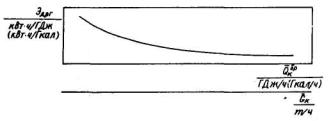 Влияние пусков турбоагрегата по диспетчерскому графику на удельный расход тепла рассчитывается по формуле где n - число пусков турбоагрегата по диспетчерскому графику; Э - выработка электроэнергии турбоагрегатом, МВт·ч. 4.3.23. Поправки к мощности турбоагрегатов, оговоренные в пп. 4.3.9, 4.3.11.2, 4.3.11.3, 4.3.13.3, 4.3.18, 4.3.19 и 4.3.20 при нормировании показателей тепловой экономичности не используются и в энергетические характеристики турбоагрегатов включаются по инициативе электростанции. (Измененная редакция, Изм. № 1). 4.4. Энергетические характеристики конденсационных турбоагрегатов 4.4.1. Определение удельного расхода тепла на выработку электроэнергии Графическая зависимость часового расхода тепла на турбоагрегат от его электрической мощности представляется в виде кривой, описываемой полиномом n-й степени, или ломаной или спрямленной кривой. Часовой расход тепла на турбоагрегат определяется по формуле (16), а удельный расход тепла брутто на выработку электроэнергии - по формулам (13) или (14) соответственно при отсутствии или наличии турбоприводов у механизмов собственных нужд, работающих на отборном паре турбоагрегата. 4.4.2. Основные и промежуточные показатели, составляющие энергетические характеристики (Измененная редакция, Изм. № 1). 4.4.2.1. Энергетические характеристики конденсационных турбоагрегатов (турбоагрегатов типа К) должны содержать для чисто конденсационного режима при фиксированных значениях внешних факторов графические (а при необходимости также и аналитические) зависимости следующих показателей: удельного расхода тепла на выработку электроэнергии qт {кДж/(кВт·ч)[ккал/(кВт·ч)]} (рис. П4.19); часовых