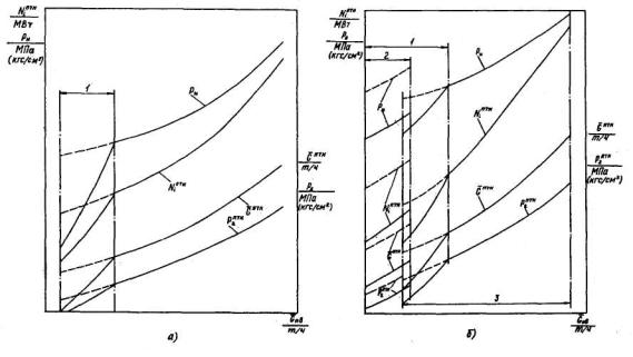 Внутренняя мощность турбопривода питательного насоса энергоблока, давление питательной воды, часовой расход пара на турбопривод, давление отработавшего пара а - однокорпусный котел; б - двухкорпусный котел; 1 - зона работы при скользящем давлении свежего пара перед стопорным клапаном турбоагрегата; 2 - в работе один корпус котла; 3 - в работе два корпуса котла; —— при номинальном давлении свежего пара; ----- при скользящем давлении свежего пара. Для котлов энергоблоков с турбоприводом питательного насоса