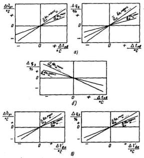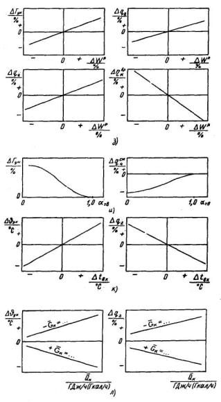 Поправки к показателям работы котла на отклонение от фиксированного значения: а - температуры питательной воды; б - температуры холодного воздуха; в- температуры воздуха перед воздухоподогревателем; г - нагрева воздуха рециркуляцией горячего воздуха; д- коэффициента рециркуляции дымовых газов; е - зольности твердого топлива; ж - влажности жидкого топлива; з - влажности твердого топлива; и - доли твердого топлива при совместном сжигании его с газом или мазутом; к - температуры сетевой воды на входе в ПВК; л - часового расхода сетевой воды через ПВК; м - температуры воздуха перед дутьевыми вентиляторами; н - доли рециркуляции горячего воздуха