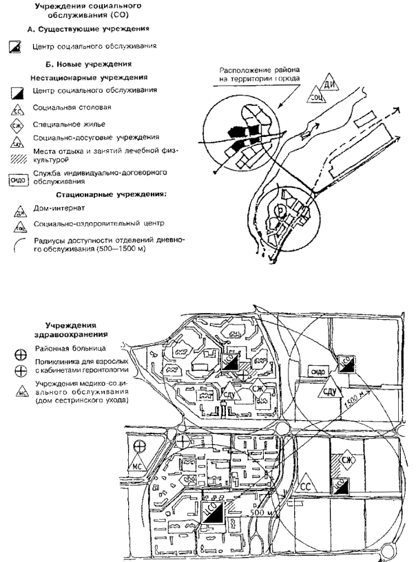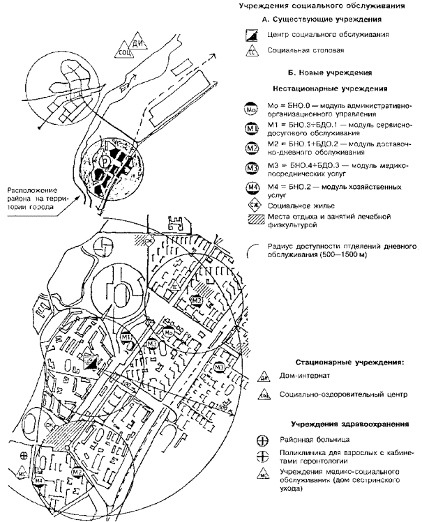 3.2 При разработке планов социального обслуживания ЛСВГ в рамках единой системы обслуживания всех категорий населения решаются типологические вопросы (определение структуры и типов учреждений), формы включения учреждений в комплексы, центры, а также градостроительные задачи (размещение объектов, резервирование территорий).