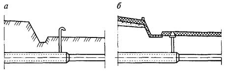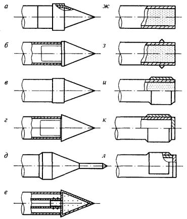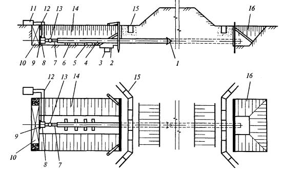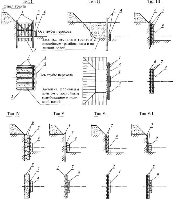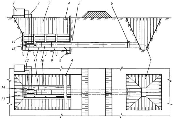 Тип I и II - для слабых грунтов (j £ 18°); тип III и IV - для средних грунтов (j £ 18 - 30°); тип V, VI и VII - для прочных грунтов (j > 30°) 1 - шпунт металлический шк-1; 2 - шпунтовая крепь; 3 - бревна диаметром 160 мм; 4 - опорный пакет; 5 - балка двутавровая № 16; 6 - сваи деревянные диаметром 200 мм; 7 - деревянные брусья 160 ´ 160 мм; 8 - бетонные блоки; 9 - опорный башмак Рисунок 12 - Конструкции типовых упорных стенок в различных грунтах После выбора хода штока гидродомкрата между нажимной заглушкой и домкратом вставляют нажимные патрубки. Продвижение защитного футляра и смену нажимных патрубков осуществляют до тех пор, пока первое звено футляра не будет полностью вдавлено в грунт под насыпью. После этого штоки гидродомкратов отводят назад вместе с заглушкой, одновременно удаляют и нажимные патрубки. На освободившееся от патрубков место укладывают второе звено, которое центрируют и присоединяют к первому звену защитного футляра сваркой. 10.191 Для производства сварочных работ в котловане сооружается приямок, в котором размещаются сварщики. Если в приямке накапливается вода, то ее время от времени удаляют насосом. 10.192 В наборе технологического оборудования необходимо иметь круг-заслонку, которая устанавливается в футляре и перекрывает его полость в случае опасности утечки обводненных грунтов дорожной насыпи через футляр. 1 - насосная станция; 2 - газопровод; 3 - рабочий котлован; 4 - водоотводной лоток; 5 - защитный футляр; 6 - лобовая обделка (нож); 7 - приемный котлован; 8 - приямок для сварки защитного футляра; 9 - направляющая рама; 10 - нажимной патрубок; 11 - нажимная заглушка; 12 - гидродомкраты; 13 - башмак; 14 - упорная стенка Рисунок 13 - Схема установки с гидродомкратами 10.193 В принятой последовательности все операции повторяют до тех пор, пока лобовой конец первого звена не войдет в приемный котлован. При необходимости защитный футляр наращивают до проектной длины со стороны приемного котлована либо с обеих сторон дороги. Прокладка защитного футляра прокалыванием10.194 Прокладка защитных футляров прокалыванием осуществляется статическим и динамическим методами. Методы прокалывания применяют для прокладки защитных футляров диаметром до 300 мм в суглинистых и глинистых грунтах нормальной влажности, не содержащих твердых включений. При этом прокладываемая труба-футляр или специальное устройство, снабженные наконечниками, вдавливаются в грунт под воздействием напорных усилий (рисунок 14). 10.195 Наконечники монтируются на переднем конце прокладываемой трубы-футляра и предназначены для уменьшения сопротивлений, возникающих при деформации грунта, и снижения сил трения при движении трубы-футляра в грунте. Это достигается тем, что наружный диаметр наконечника принимают на 20 - 50 мм больше диаметра прокладываемого футляра, благодаря чему между стенкой скважины и футляром создается некоторый зазор. 10.196 Для прокладки защитных футляров прокалыванием в основном применяются конусные наконечники (рисунок 15, а, б, в, г, д) и расширительные пояса с заглушками (рисунок 15, к, л). При небольшой длине прокладки применяют прокалывание открытым концом прокладываемой трубы-футляра без какого-либо наконечника (рисунок 15, ж) или с расширительным кольцом, приваренным к трубе-футляру (рисунок 15, з). В этих случаях прокладываемый кожух открытым концом вдавливается в грунт, который в виде керна проникае