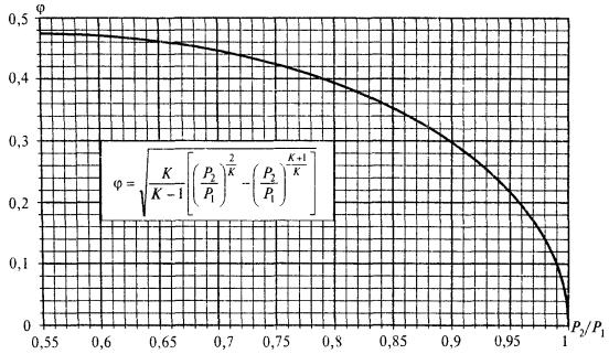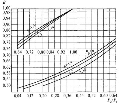 Рисунок 6 - Зависимость коэффициента В от Р2/Р1. Выбор фильтра5.36 Пропускная способность фильтра должна определяться исходя из максимального допустимого перепада давления на его кассете, что должно быть отражено в паспорте на фильтр. 5.37 Фильтры, устанавливаемые в ГРП (ГРУ) для защиты регулирующих и предохранительных устройств от засорения механическими примесями, должны соответствовать данным, приведенным в таблице 10. Таблица 10