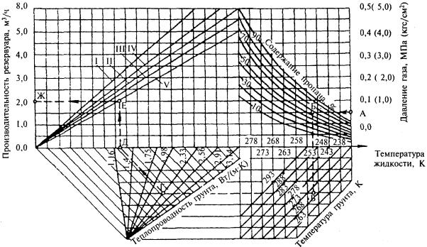 7.13 Технические характеристики выпускаемой отечественными заводами-изготовителями запорной арматуры и перечень заводов-изготовителей приведены соответственно в приложениях Е и Ж. 8 РЕЗЕРВУАРНЫЕ И БАЛЛОННЫЕ УСТАНОВКИ СУГ8.1 Требования настоящего раздела распространяются на проектирование систем газоснабжения СУГ от резервуарных и баллонных установок, а также на проектирование испарительных установок и установок по смешению СУГ с воздухом. Для резервуарных установок следует применять стальные резервуары цилиндрической формы, устанавливаемые подземно или надземно. В резервуарах следует предусматривать уклон не менее 2 ‰ в сторону сборника конденсата, воды и неиспарившихся остатков. При этом сборник конденсата не должен иметь выступов над нижней образующей резервуара, препятствующих полному сбору и удалению конденсата воды и неиспарившихся остатков. Для надземной установки разрешается предусматривать как стационарные, так и транспортабельные (съемные) резервуары, наполняемые СУГ на ГНС. 8.2 Производительность резервуаров вместимостью 2,5 и 5 м3 при подземном расположении и естественном испарении следует определять по рисунку 7. I - резервуар 5 м3, заполнение 85 %; II - резервуар 5 м3, заполнение 50 %; III - резервуар 5 м3, заполнение 35 % и резервуар 2,5 м3, заполнение 50 %; IV - резервуар 2,5 м3, заполнение 85 %; V - резервуар 2,5 м3, заполнение 35 % Рисунок 7 - Номограмма для определения производительности резервуара сжиженного газа вместимостью 2,5 и 5 м3 (подземного) Пример. Дано: давление газа - 0,04 МПа (0,4 кгс/см2); содержание пропана - 60 %; температура грунта - 270 К; теплопроводность грунта - 2,33 Вт/(м×К); заполнение 35 %. Находим производительность резервуаров - 2 м3/ч по линии А-Б-В-Г-Д-Е-Ж (рисунок 7). Примечание. Для резервуаров большей вместимости их производительность следует определять опытным путем. 8.3 Для учета теплового воздействия подземных резервуаров, расположенных на расстоянии не более 1 м один от другого, полученную по номограмме производительность следует умножить на коэффициент теплового воздействия т в зависимости от числа резервуаров в установке: