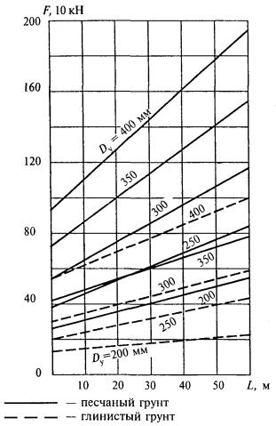 Усилия протаскивания газопровода рассчитаны исходя из следующих прочностных характеристик полиэтилена: ПЭ 80 - sт - 15,0 МПа; ПЭ 100 - sт - 25,0 МПа. Для предупреждения повреждения полиэтиленового газопровода при протаскивании соединение расширителя с газопроводом следует изготавливать таким, чтобы оно разрывалось при возникновении усилия протаскивания газопровода Ргп, большего, чем приведенное в таблице Л.1. Л.1.7 Выбор бурильной установки производится по результатам расчета общего усилия протаскивания Р согласно разделу Л.4 настоящего приложения. Примеры расчета общего усилия протаскивания Ргп и усилия протаскивания газопровода из полиэтиленовых труб Ргп диаметром 110 мм при строительстве подводного перехода приведены в приложении М. Л.1.8 Диаметр бурового канала для протаскивания стального газопровода определяется проектом и зависит от возможностей бурильной установки, применяемого оборудования, длины и диаметра прокладываемого газопровода. Л.1.9 Соотношения диаметра бурового канала, диаметра трубы и длины газопровода из полиэтиленовых труб приведены в таблице Л.2. Таблица Л.2