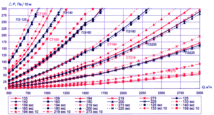 Удельные потери давления для стальных и полиэтиленовых труб (новых и бывших в эксплуатации) низкого давления (Q 500 - 3000 м3/ч, r = 0,73 кг/м3, n = 1,4 ´ 10-6 м2/с)