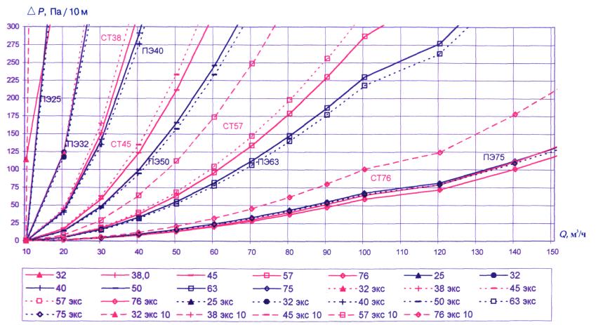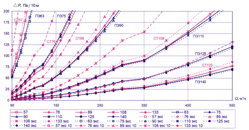 Удельные потери давления для стальных и полиэтиленовых труб (новых и бывших в эксплуатации) низкого давления (Q 10 - 150 м3/ч, r = 0,73 кг/м3, n = 1,4 ´ 10-6 м2/с)
