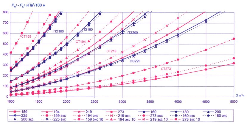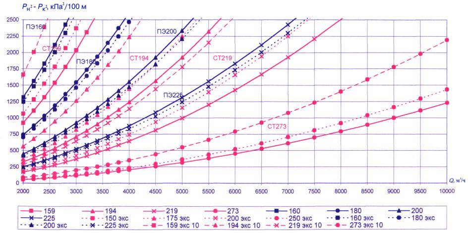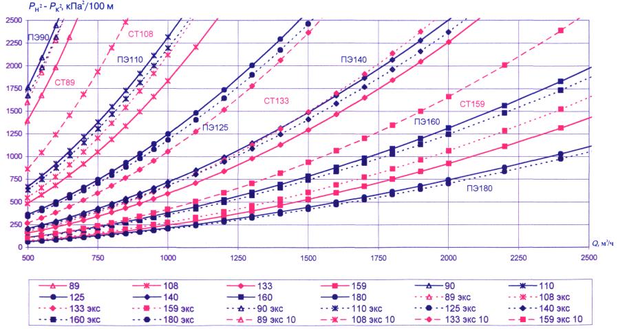Удельные потери давления для стальных и полиэтиленовых труб (новых и бывших в эксплуатации) высокого давления (Q 500 - 2500 м3/ч, r = 0,73 кг/м3, n = 1,4 ´ 10-6 м2/с)