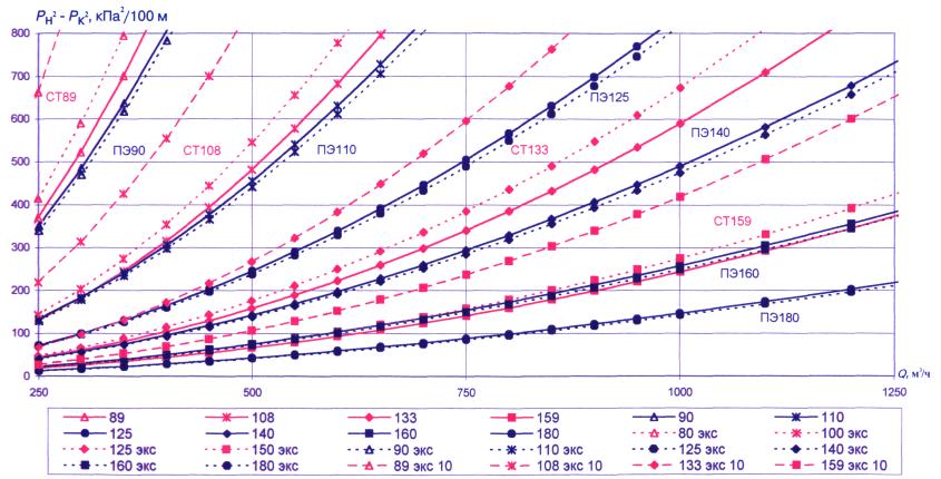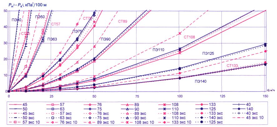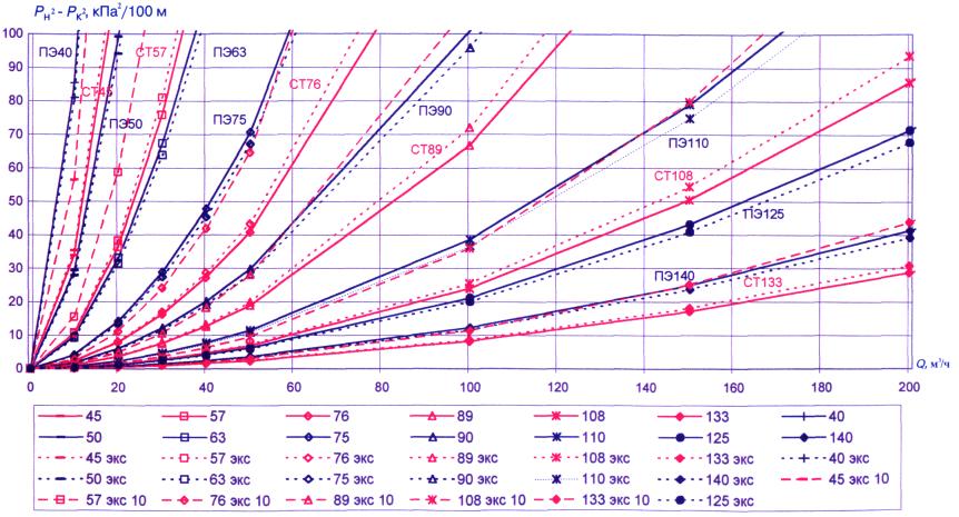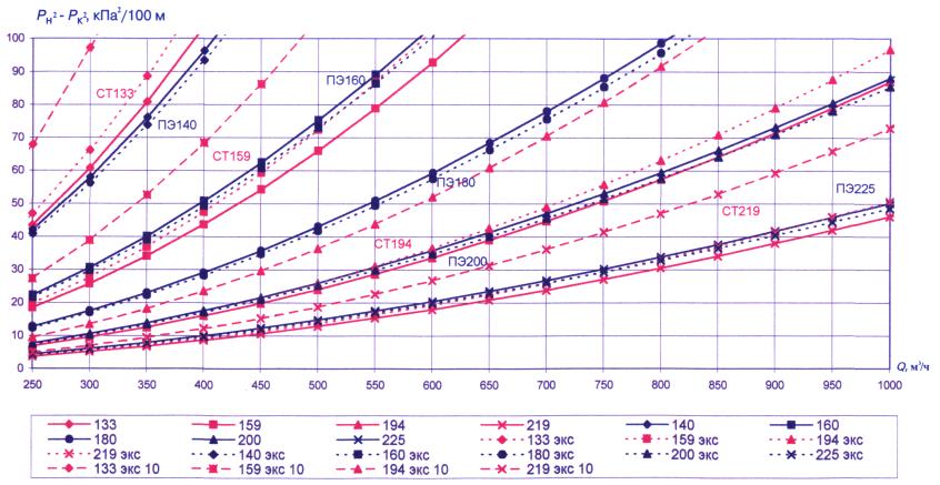 ПРИЛОЖЕНИЕ Б(рекомендуемое) НОМОГРАММЫ РАСЧЕТА ДИАМЕТРА ГАЗОПРОВОДААбсолютная шероховатость внутренней поверхности газопроводов принята: из стальных труб п = 0,01 см; из полиэтиленовых труб п = 0,0007 см. Наружные диаметры и толщины стенок стальных и полиэтиленовых газопроводов, использованные при построении номограмм, приведены в таблице Б.1. В номограммах приняты следующие условные обозначения: буквенные: - СТ108 - газопровод из стальных труб диаметром D = 108 мм; - ПЭ110 - газопровод из полиэтиленовых труб диаметром D = 110 мм; линейные: - сплошная линия - для новых труб; - штриховая линия «экс» - для труб после годичной эксплуатации с учетом увеличения эквивалентной абсолютной шероховатости до 0,02 см для стальных труб и увеличения диаметра до 5 % под воздействием внутреннего давления для полиэтиленовых труб; - штриховая линия «экс 10» - для стальных труб после 10-летней эксплуатации с учетом увеличения эквивалентной абсолютной шероховатости до 0,1 см. Таблица Б.1