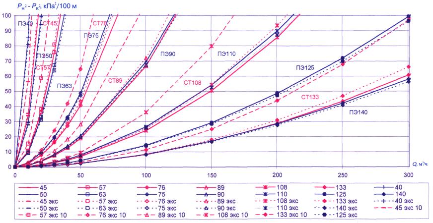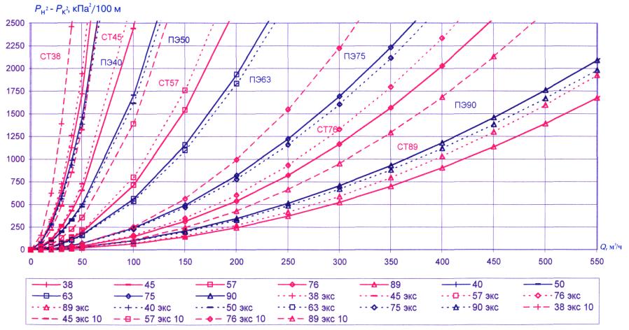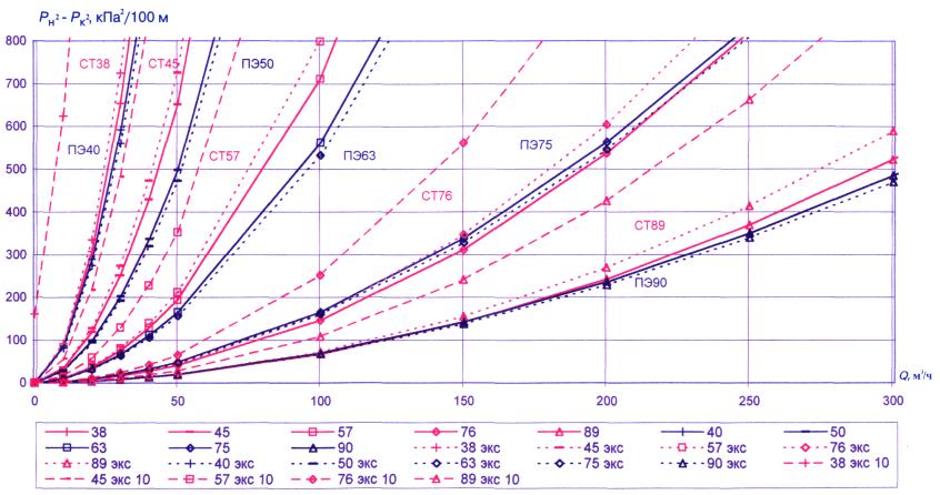 Удельные потери давления для стальных и полиэтиленовых труб (новых и бывших в эксплуатации) высокого давления (Q 0 - 550 м3/ч, r = 0,73 кг/м3, n = 1,4 ´ 10-6 м2/с)