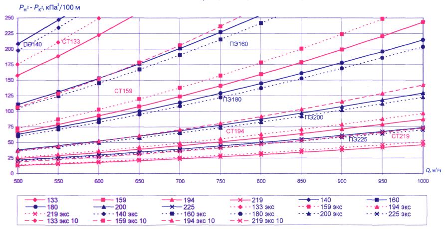 Удельные потери давления для стальных и полиэтиленовых труб (новых и бывших в эксплуатации) высокого давления (Q 500 - 1000 м3/ч, r = 0,73 кг/м3, n = 1,4 ´ 10-6 м2/с)