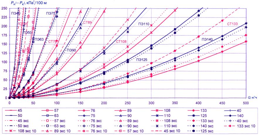 Удельные потери давления для стальных и полиэтиленовых труб (новых и бывших в эксплуатации) высокого давления (Q 0 - 500 м3/ч, r = 0,73 кг/м3, n = 1,4 ´ 10-6 м2/с)