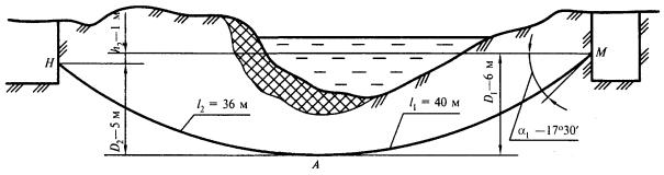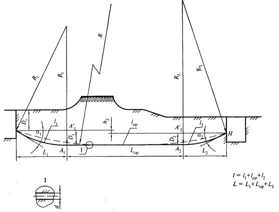 где l2 - теоретическая длина пилотной скважины от точки максимальной глубины до точки выхода в выходном приямке (от точки А2 до точки Н), м. Л.2.10 Общая длина пилотной скважины l от точки входа до точки выхода (рисунок Л.1) состоит из: l = l1 + lпр + l2, (15) где lпр - длина прямолинейного участка; l - общая длина пилотной скважины от точки входа до точки выхода (от точки М до точки Н). Рисунок Л.4 - Расчетные параметры пилотной скважины При наличии нескольких прямолинейных и криволинейных участков общую длину пилотной скважины рассчитывают по формуле l = l1 +l1пр + l1кр + l2пр + l2кр + l3пр + … + l2, (16) где l1пр; l1кр; l2пр; l2кр; l3пр - длины различных прямолинейных и криволинейных участков. Л.2.11 Длина пилотной скважины в плане L1 от точки входа в грунт до точки максимального заглубления (рисунок Л.1) определяется по формуле