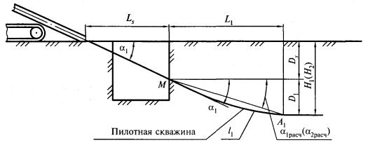 где R1 - радиус кривизны пилотной скважины при забуривании, м; D1 - заглубление пилотной скважины от точки забуривания (определяется проектом). Длина пилотной скважины l1 при переходе от максимального угла при забуривании к нулевому углу (рисунки Л.1, Л.2) рассчитывается по формуле