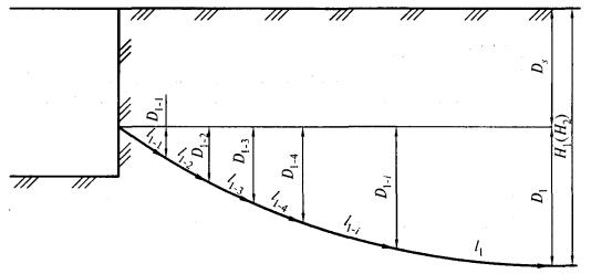 где a1-i(расч) - средний расчетный текущий угол для вычислений; ai - текущий угол (в пределах от a1 при забуривании до 0°), рассчитывается по формуле ai = a1 - iDa1, (10) где i - текущее число штанг, необходимое для проходки пилотной скважины длиной l1 (i = 1; 2; 3, ..., n1). Л.2.7 Расчет текущего заглубления пилотной скважины D1-i (рисунки Л.2, Л.3) D1-i = l1-isina1-i(расч), (11) где l1-i - текущая длина пилотной скважины (от 0 до l1); a1-i(расч) - средний текущий расчетный угол. На рисунке Л.3 графически показаны: - текущая длина пилотной скважины: li = l1-1; l1-2; l1-3, …, l1; - текущее заглубление пилотной скважины: Di = D1-1; D1-2; D1-3; …, D1. При этом расчет текущего заглубления на выходе газопровода (на длине l2) выполняется аналогично расчету на входе (на длине l1). Л.2.8 Радиус кривизны пилотной скважины R2 на выходе пилотной скважины из грунта (рисунок Л.1) рассчитывается по формуле