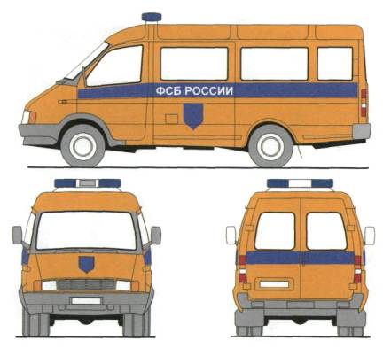 Рисунок А.33 - Цветографические схемы автомобилей органов федеральной службы безопасности, используемых для проведения неотложных действий по пресечению террористических актов
