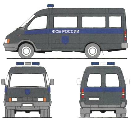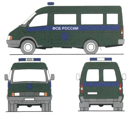 Рисунок А.34 - Цветографические схемы автомобилей органов федеральной службы безопасности, используемых для проведения неотложных действий по пресечению террористических актов