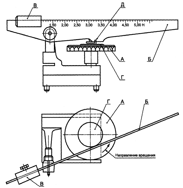 Начинают испытания с нагрузки 5,0 Н. Перемещают рычаг Б в вертикальное положение. Фиксируют образец зажимным диском Г так, чтобы образец не скользил при испытаниях.