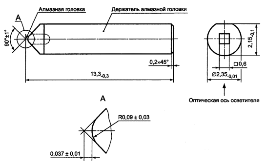 - головки алмазной полусферической царапающей Д радиусом (0,090 + 0,003) мм, расположенной в конусе с углом 90° ±1° (см. рисунок Д.2). Головка монтируется в передней части держателя плоской стороной на основании удерживающей полости. Используется алмаз, сертифицированный изготовителем в органах метрологии и откалиброванный в соответствии с Д.3 настоящего приложения;