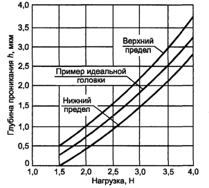 Проникающие при нагрузке 4,0 Н на глубину 4 мкм и более алмазные головки считаются непригодными. Для испытаний используют алмазные головки, имеющие глубину проникания, соответствующую предельным кривым (рисунок Д.5).