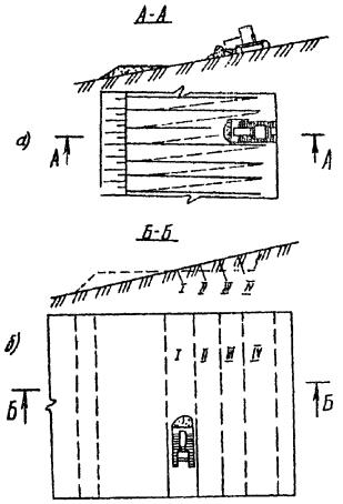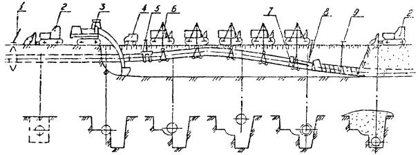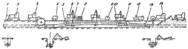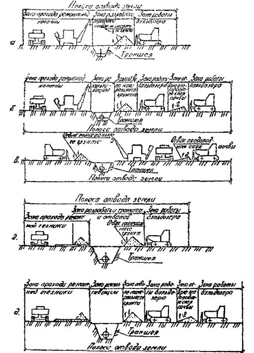 6.31. При неблагоприятных гидрогеологических условиях или в грунтах, не перечисленных в табл. 3 (торф, сыпучие пески и др.), крутизну откосов следует назначать на основании материалов изысканий в индивидуальном порядке с учетом требований механизированного способа производства работ. 6.32. Выбор типа землеройного механизма для разработки траншей при капитальном ремонте трубопровода на отдельных участках трассы зависит от местных топографических и гидрогеологических условий, принятого способа ремонта и темпа работ, диаметра трубопровода, времени года и других условий. 6.33. На прямолинейных участках трассы со спокойным рельефом местности, на участках трассы, где трубопровод уложен по радиусу упругого изгиба, а также в грунтах I - IV категорий без крупных включений траншею можно разрабатывать специальными вскрышными экскаваторами. 6.34. В грунтах с крупными каменистыми включениями, в мерзлых грунтах с промерзанием до 0,25 м, в сыпучих и обводненных грунтах траншеи разрабатываются одноковшовым экскаватором. Эти экскаваторы применяются также в местах резких поворотов трассы и в местах, где глубина залегания трубопровода часто меняется и превышает величину предельной глубины копания специальных вскрышных экскаваторов. 6.35. При сильном притоке грунтовых вод необходимо предусмотреть искусственное водопонижение, а при илистых оплывающих грунтах или при возможном выносе частиц грунта следует применять шпунтовые крепления. 6.36. Работы по открытому водоотливу и искусственному понижению зеркала грунтовых вод должны производиться в соответствии со СНиП 3.02.01-87 «Основания и фундаменты» /13/. 6.37. Режим водоотлива должен быть таким, чтобы постоянно поддерживать уровень воды ниже нижней образующей трубы до окончания ремонтных работ, кончая засыпкой отремонтированного трубопровода. 6.38. Водоотлив должен осуществляться механизированным способом с помощью центробежных насосов и водоотливных агрегатов. 6.39. При разработке траншеи ее необходимо защищать от затопления и размыва поверхностными водами путем замещения отвалов грунта с нагорной стороны, соответствующей планировкой примыкающей территории, а в необходимых случаях - устройством водоотводных канав и другими способами. 6.40. Грунт, вынутый из траншей, как правило, следует укладывать в отвал с одной (левой по направлению работ) стороны траншеи, оставляя другую сторону свободной для передвижения транспорта и производства прочих работ. 6.41. Во избежание обвала вынутого грунта в траншею, а также обрушения стенок траншеи основание отвала вынутого грунта следует располагать в зависимости от состояния грунта и погодных условий, но не ближе 0,5 м от края траншеи. 6.42. Размещение отвалов минерального и плодородного грунта относительно оси трубопровода может быть одностороннее или двухстороннее (рис. 10а, б, в). Схема размещения отвалов грунта выбирается в зависимости от взаимного расположения параллельно проложенных трубопроводов и других коммуникаций, возможного направления движения ремонтной колонны, с учетом местных условий и других факторов и устанавливается для каждого участка в ППР. 6.43. При больших габаритах траншеи (рис. 10г, д) допускается размещать отвалы минерального грунта по обе стороны траншеи. При этом на одной стороне размещается максимально возможная часть грунта, а оставша