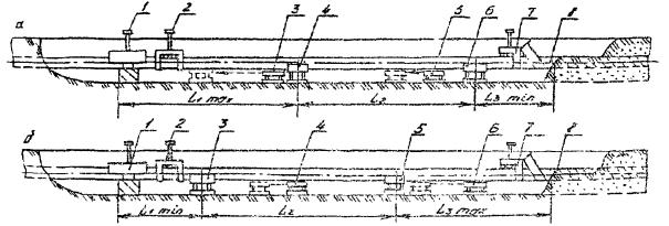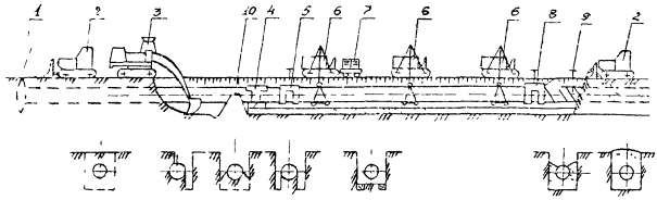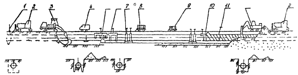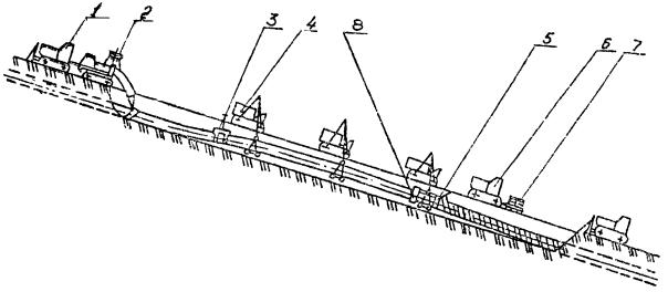 Поддержание трубопровода трубоукладчиками, оснащенными навесной стрелой-опорой СО-17.21. Технологическая схема ремонта с применением трубоукладчиков, оснащенных навесной стрелой-опорой СО-1 приведена на рис. 21. Схематично обозначены трубоукладчики без стрелы-опоры. Способ ремонта - поточно-циклический. 7.22. Усилие на стреле-опоре СО-1 должно измеряться динамометром и непрерывно контролироваться машинистом трубоукладчика. Категорически запрещается превышать расчетные значения усилий. 7.23. Расчетные значения усилия подъема должны указываться в проекте производства работ каждого конкретного ремонтируемого участка. 7.24. Ремонт нефтепровода диаметром 820 мм комплексным потоком повышенной производительности производится с частичным подъемом без остановки перекачки при давлении до 2,0 МПа на ремонтируемом участке. Высота подъема ремонтируемого участка в момент перемещения грузоподъемных механизмов не должна превышать 0,2 м. Во время разработки грунтовой перемычки (рис. 22) допускается подъем ремонтируемого участка на высоту до 0,6 м. При этом подъем и спуск трубопровода должен производиться с соблюдением требований /6/. 7.25. Схемы расстановки ремонтных машин и порядок перемещения с применением 3 трубоукладчиков, технологические параметры ремонтной колонны, а также способы разработки перемычки представлены в Инструкции /10/. Рекомендуемые технологические параметры приведены в табл. 8, 9. Схемы расстановки ремонтных машин и механизмов при ремонте с использованием стрелы-опоры СО-1 1, 2, 3 - стрела-опора СО-1; 4 - изоляционная машина; 5 - подкапывающая машина; 6 - очистная машина. Рис. 21. Устранение перемычки 1 - трубоукладчики, оборудованные СО-1; 2 - изоляционная машина; 3 - очистная машина; 4 - подкапывающая машина. Рис. 22. Таблица 8 Рекомендуемые технологические параметры при ремонте трубопроводов диаметром 820 мм комплексным потоком повышенной производительности с использованием трех трубоукладчиков, оснащенных стрелой-опорой СО-1