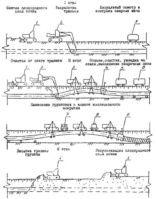 1992 Настоящие Правила предназначены для инженерно-технических работников, занимающихся проектированием и проведением капитального ремонта магистральных трубопроводов (нефтепроводов и нефтепродуктопроводов). Правила разработаны в институте ВНИИСПТнефть*. Ответственные исполнители: д.т.н. А.Г. Гумеров, к.т.н. Р.С. Гумеров, к.т.н. Х.А. Азметов, к.т.н. Ф.Г. Хайруллин, м.н.с. Г.К. Ермилина, инженер Э.Г. Сатаева. * Ныне Институт проблем транспорта энергоресурсов (ИПТЭР) В разработке принимали участие: Е.М. Павлов (Компания «Транснефть»), начальник отдела ПОКР Х.Н. Ягуров (ПО Урало-Сибирских магистральных нефтепроводов) Э.Т. Леккай (ПО Северо-Западных магистральных нефтепроводов), зам. начальника отдела КР и КС А.Я. Князев (ПО Приволжских магистральных нефтепроводов). ПРАВИЛА КАПИТАЛЬНОГО РЕМОНТА ПОДЗЕМНЫХ ТРУБОПРОВОДОВ Вводится взамен РД 39-30-297-79 Срок введения установлен с 10.01.92 г. В правилах изложены основные положения технологического процесса механизированного ремонта нефтепроводов с заменой изоляционного покрытия в нормальных условиях с подъемом трубопровода в траншее, с подъемом и укладкой трубопровода на лежки в траншее, без подъема трубопровода с сохранением его положения, комплексным потоком повышенной производительности с частичным подъемом трубопровода диаметром 820 мм в траншее, а также основные положения капитального ремонта в зимнее время, в горных условиях и ремонта трубопровода диаметром 720 мм с заменой изоляционного покрытия с одновременным заглублением путем переукладки в новую траншею. 1. ОБЩИЕ ПОЛОЖЕНИЯ1.1. В Правилах устанавливаются основные положения по капитальному ремонту подземных трубопроводов с заменой изоляционного покрытия и восстановлением стенки трубы. 1.2. Капитальному ремонту должна предшествовать четкая разработка мероприятий организационной подготовки, которая осуществляется на основании материалов предварительного обследования участка нефтепровода. 1.3. Правила не распространяются на ремонт трубопроводов: а) на переходах через водные преграды (реки, озера, болота), автомобильные, железные дороги I - IV категорий, а также проложенных в тоннелях, по морским эстакадам; б) из нестальных труб; в) предназначенных для перекачки нефти с подогревом; г) с заменой труб. 1.4. Ответственность за обеспечение безопасности производства работ при капитальном ремонте действующих трубопроводов несет должностное лицо организации (РУМН, РСУ), осуществляющей работы, назначенное приказом этой организации. Ответственность за соблюдение требований пожарный безопасности, охраны труда и окружающей среды при выполнении ремонтных работ несет инженерно-технический работник организации, производящей капитальный ремонт, назначенный соответствующим приказом. 1.5. Для осуществления технического надзора за качеством ремонта, соблюдением технологического режима работы трубопровода, приемки выполненных работ и составлением документации на выполнение работы приказом по РУМН (ПОМН) назначается лицо из числа работников служб РУМН или ПОМН с привлечением в необходимых случаях представителей специализированной организации. 1.6. Капитальный ремонт комплексным потоком повышенной производительности распространяется на нефтепроводы диаметром 820 мм, проложенные в нормальных условиях, в устойчивых грунтах, по равнинно-холмистой 