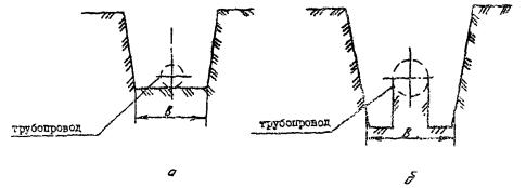 6.15. Минимальная ширина полосы, с которой снимается плодородный слой почвы, должна равняться ширине траншеи по верху плюс 0,5 м в каждую сторону /15/. 6.16. Плодородный слой почвы на площади, которую будет занимать траншея, должен быть снят и уложен в отвал для использования его при восстановлении (рекультивации) нарушенных участков. 6.17. Толщина плодородного слоя почвы и места его снятия по трассе устанавливаются в ППР на основании материалов изысканий. 6.18. При снятии, перемещении и хранении плодородного слоя почвы не допускается смешивание его с подстилающими породами, загрязнение жидкостями и материалами. 6.19. Использование плодородного слоя почвы для засыпки траншей, приямков, котлованов и т.д. запрещается. 6.20. В пустынных районах и необжитых отдаленных местностях условия приведения нарушенных земель в состояние, пригодное для использования в сельском или лесном хозяйстве, определяются в каждом конкретном случае индивидуально. Разработка траншей6.21. Для устойчивой и надежной работы машин и механизмов полоса трассы перед проходом ремонтной колонны, при необходимости, должна быть спланирована. 6.22. Поперечный профиль и размеры разрабатываемой траншеи устанавливаются рабочим проектом в зависимости от принятого способа ремонта, диаметра ремонтируемого трубопровода, габаритных размеров ремонтных машин и механизмов и указываются в проекте производства работ. 6.23. При ремонте способом с подъемом трубопровода в траншее и с подъемом и укладкой трубопровода на лежки в траншее трубопровод должен быть вскрыт до нижней образующей и расположен как показано на рис. 9а. При ремонте без подъема трубопровода с сохранением его положения трубопровод должен быть вскрыт ниже нижней образующей на глубину не менее 1 м и расположен как показано на рис. 9б. 6.24. При механизированном выполнении ремонтных работ размеры траншеи должны быть достаточными для свободного перемещения по трубе очистных и изоляционных машин. Ширина траншеи по низу должна быть не менее Dтр + 1,0 м. 6.25. При разработке траншеи специальными вскрышными экскаваторами ее ширина по низу B равна: B = Dтр + 2А, где D - диаметр трубопровода; A - ширина режущей кромки рабочего органа машины. Для трубопроводов диаметром 219 - 530 мм A = 0,5 м; более 530 мм A = 0,7 м. При разработке траншеи одноковшовыми экскаваторами ширина траншеи по низу B равна: B = D + 2к + 2δ, где к - ширина режущей кромки ковша, к = не менее 0,5 м. Во избежание повреждения трубопровода минимальное расстояние δ между стенкой трубы и ковшом работающего экскаватора должно быть не менее 0,15 - 0,20 м. Поперечные профили траншей а - при ремонте с подъемом трубопровода в траншее; б - при ремонте без подъема трубопровода. Рис. 9. В каждом случае принимаемая ширина траншеи при разработке одноковшовым экскаватором должна обосновываться технико-экономическим расчетом. 6.26. Ширина траншеи по низу при разработке грунта землеройными машинами цикличного действия должна соответствовать ширине, указанной в п. 5.24,б, с добавлением в песчаных грунтах и супесях 0,15 м, в глинах и суглинках - 0,1 м. 6.27. Траншеи с вертикальными стенками без крепления разрабатываются в грунтах естественной влажности с ненарушенной структурой при отсутствии грунтовых вод на глубину, м: в насыпных песчаных и гравелистых грунтах - не более 1; в супесях - не более 1,25; в суглинках и глинах - не более 1,5 в
