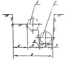 6.74. Анкеровка (закрепление) экскаваторов осуществляется с помощью одного или нескольких тракторов или бульдозеров. При этом экскаватор работает сверху вниз. В качестве подвижных якорей используется один или два трактора или бульдозер. Использование бульдозера даст возможность применять его для планировки грунта по ходу экскаватора, тросы (диаметром 26 - 28 мм) прикрепляют к тумбе экскаватора или к балкам его ходовой части. 6.75. При анкеровке экскаваторов необходимо учитывать состояние поверхности грунта. На увлажненных размокших грунтах удерживающая сила должна быть увеличена. В период дождей, когда грунт насыщается водой, возрастает опасность образования оползней. Необходимо закреплять работающие механизмы независимо от величины уклона. При этом тракторы (бульдозеры), выполняющие функции якоря, должны находиться на верху склона. 6.76. При засыпке трубопровода необходимо обеспечить сохранность труб и изоляции, а также плотное прилегание трубопроводов ко дну траншеи. 6.77. Засыпка отремонтированного трубопровода, уложенного в траншею на полках и на продольных склонах, производится аналогично засыпке в скальных грунтах на равнинной местности, т.е. с предварительным устройством постели и присыпкой трубопровода легким грунтом. Если использование легкого грунта для устройства постели под трубопровод и присыпки неэкономично, то трубопровод должен быть защищен футеровкой из деревянных реек, покрытием из соломенных или камышовых матов. 6.78. Методы работы землеройных машин при засыпке траншей на крутых подъемах и спусках аналогичны методам работы при вскрытии траншеи. Если грунт для засыпки распланирован по полке, то окончательная засыпка трубопровода скальным грунтом производится бульдозером; в том случае, если грунт находится у бровки со стороны откоса, то возможно использование одноковшового экскаватора. При этом работа бульдозера возможна как поперечными проходами так и косыми под углом к траншее (ввиду ограничения рабочей зоны). Засыпка траншей на крутых склонах и подъемах производится передвижением машин вдоль или под углом к траншее. 6.79. Для предотвращения оползания и скатывания грунта вниз по откосу, размыва ливневыми водами при защите трубопровода мягким грунтом должны быть устроены перемычки из мешков, заполненных землей, или деревянных щитов через каждые 5 - 10 м. Особенности разработки траншеи при ремонте с заменой изоляционного покрытия и одновременным заглублением путем переукладки в новую траншею6.80. Ширина траншеи по низу при разработке одноковшовым экскаватором должна быть (рис. 17): B = 2Д + К + 2δ, м где B - ширина траншеи по низу; Д - диаметр трубопровода; К - ширина режущей кромки рабочего органа, не менее 0,5 м; δ = 0,25 … 0,30 м. В каждом случае принимаемая ширина траншеи при разработке одноковшовым экскаватором должна обосновываться технико-экономическим расчетом. Контроль качества и приемка земляных работ6.81. Контроль качества земляных работ заключается в систематическом наблюдении и проверке соответствия выполняемых работ проектной документации, требованиям СНиП III-42-80 /16/ и соблюдении допусков, приведенных в табл. 5 /17/. 6.82. Цель контроля - предупредить возникновение брака и дефектов в процессе производства работ, исключить возможность накопления дефектов, повысить личную ответственность исполнителей. Табл