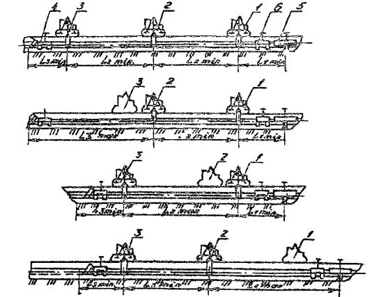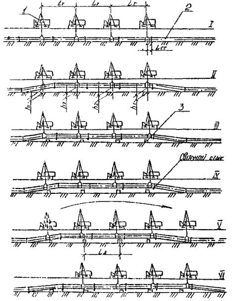 Подъем, удержание и укладка трубопровода, имеющего дефекты, должны производиться после исправления дефектов и с остановкой перекачки. 7.10. Подъем трубопровода следует осуществлять плавно, без рывков и резких колебаний. Контроль величины расчетных усилий на крюках трубоукладчиков производится динамометрами. 7.11. Начало (или конец) приподнимаемого участка трубопровода должно находиться от линейных задвижек или других мест защемления на расстоянии не менее: для трубопроводов диаметром до 500 мм - 50 м; 500 - 700 м - 40 м; более 700 мм - 50 м. 7.12. На время длительных остановок и в конце смены трубопровод следует укладывать на лежки, опоры-крепи и др., обеспечивающие удержание трубопровода в исходном положении. Для предотвращения боковых смещений трубопровода, уложенного на лежки, устанавливаются боковые упоры. Подъем и укладка трубопровода на лежки7.13. Подъем и укладка трубопровода на лежки применяется при ремонте по способу с подъемом и укладкой трубопровода на лежки в траншее и для монтажа (демонтажа) машин и механизмов при ремонте по способу подъема трубопровода в траншее. Подъем и укладка трубопровода на лежки осуществляется трубоукладчиками, оборудованными мягкими полотенцами, по двум схемам (рис. 18, 19). 7.14. На рис. 18 показана схема расстановки и перемещения трубоукладчиков и последовательность операций при подъеме и укладке трубопровода на лежки одновременно обоими трубоукладчиками (на рисунке условно показаны три трубоукладчика). Схема подъема и укладки нефтепровода на лежки одновременно тремя трубоукладчиками 1 - трубоукладчики; 2 - нефтепровод; 3 - лежка; Lт - расстояния между трубоукладчиками; Lл - расстояние между лежками; Lст - расстояние от места установки полотенца до поперечного сварного стыка; h1 - высота подъема под крайними трубоукладчиками; h2 - высота подъема под средним трубоукладчиком. Рис. 18. Схема подъема и укладки нефтепровода на лежки с переходом одного трубоукладчика 1 - трубоукладчик; 2 - нефтепровод; 3 - лежка; Lт - расстояния между трубоукладчиками; Lл - расстояние между лежками; Lст - расстояние от места установки полотенца до поперечного сварного стыка; h1 - высота подъема под крайними трубоукладчиками; h2 - высота подъема под средними трубоукладчиками. Рис. 19. Позиция I. Расстановка трубоукладчика на расстояние друг от друга и установка полотенец. Расстояние от места установки полотенца до поперечного сварного стыка Lст - не менее 3 м. Позиция II. Подъем трубопровода одновременно всеми трубоукладчиками на заданную технологическую высоту. Позиция III. Укладка лежек под приподнятый трубопровод в местах стропления полотенец. Лежки должны быть расположены от стыка на расстоянии не менее 3 м. Позиция IV. Спуск трубопровода на лежки одновременно всеми трубоукладчиками. Позиция V. Переход трубоукладчиков в следующее исходное положение и последующая расстановка их в порядке, описанном в позиции I. Далее операции повторяются в указанной последовательности. 7.15. На рис. 19 показана схема расстановки и перемещения трубоукладчиков и последовательность операций при подъеме и укладке трубопровода на лежки с переходом одного трубоукладчика (на рисунке условно показано четыре трубоукладчика). Позиция I. Расстановка трубоукладчиков на расстоянии друг от друга и установка полотенец. Расстояние от места установки полотенца до поперечного с