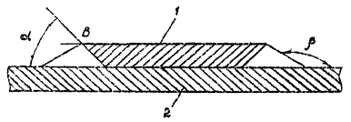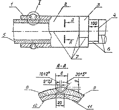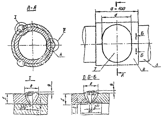 9.29. Поперечные кромки муфт с технологическими кольцами, а также одна из кромок технологических колец должны быть подготовлены под сварку под углом 40 … 50° без притупления (рис. 25). 9.30. Накладные элементы должны плотно прилегать к наружной поверхности трубы. 9.31. Непосредственно перед сваркой кромки накладных элементов, прилегающие к ним внутренние и наружные поверхности должны быть зачищены на ширину не менее 10 мм. Участки поверхности трубы, прилегающие к кромкам заплат и муфт, шириной не менее четырех толщин стенки трубы должны быть очищены до металлического блеска. 9.32. Места повреждений металла труб должны быть очищены от ржавчины и покрыты материалом, предотвращающим дальнейшую коррозию. 9.33. Непосредственно перед сваркой по периметру накладных элементов ультразвуковым толщиномером должна быть определена толщина стенки трубы с точностью ±0,1 мм. 9.34. Накладные элементы устанавливают на поверхность трубы, стягивают до получения необходимого зазора и удерживают с помощью сборочных скоб или центратором. 9.35. Технологические кольца следует собирать аналогично сборке муфт. Скошенная кромка кольца должна быть обращена к муфте. Зазор между муфтой и технологическим кольцом или заплатой и технологическими сегментами должен быть в пределах 4 … 5 мм. 9.36. Приварка продольных швов накладных элементов к стенке трубопровода не допускается. 9.37. На месте сборки продольных швов должна быть положена пластина толщиной 2 мм или стеклоткань шириной 100 … 150 мм. Схема монтажа и сборки муфты с технологическими кольцами 1 - технологическое кольцо; 2 - полумуфта; 3 - технологическое кольцо; 4 - поперечный строительный шов; 5 - нефтепровод; 6 - продольные заводские швы; 7 - монтажные швы; 8 - стенка нижней полумуфты; 9 - стенка верхней полумуфты; 10 - стенка трубы; 11 - прокладка толщиной 1 - 2 мм. Рис. 24. Разделка кромок и сварка коротких муфт и заплат 1 - заплата, муфта; 2 - труба. Рис. 25. 9.38. Схема монтажа и сборки муфты с технологическими кольцами показана на рис. 25. 9.39. Накладные элементы без технологических сегментов, штуцера для вентиля привариваются угловыми швами, имеющими форму неравнобедренного треугольника с основанием не менее 1,5 толщины накладных элементов или стенки трубы. Переход от шва к поверхности трубы должен быть плавным и образовать угол β ≥ 150° (рис. 25). 9.40. Продольный и поперечный сварные швы муфт и технологических колец, а также круговой шов заплаты и технологических сегментов должны перекрывать основной металл в каждую сторону от шва на 2 … 3,5 мм и иметь усиление высотой 1 … 2 мм с плавным переходом к основному металлу. Если усиление больше 2 мм, то оно должно сниматься до необходимого уровня шлифовкой. 9.41. С целью улучшения качества сварного шва начало и конец каждого слоя следует смещать по периметру накладных элементов. 9.42. При сварке угловых швов кратер следует выводить на металл накладного элемента с последующей его заваркой и зачисткой. 9.43. Перед каждым последующий зажиганием сварочной дуги, а также перед наложением следующих швов необходимо удалять шлак, брызги наплавленного металла. 9.44. Катодные выводы, которые были повреждены в процессе ремонта нефтепровода, должны быть приварены стенке трубы. Не рекомендуется приваривать катодные выводы к сварным швам. 9.45. Катодные выводы должны изготавливаться из малоуглеродистой проволоки (марки Св-08, 