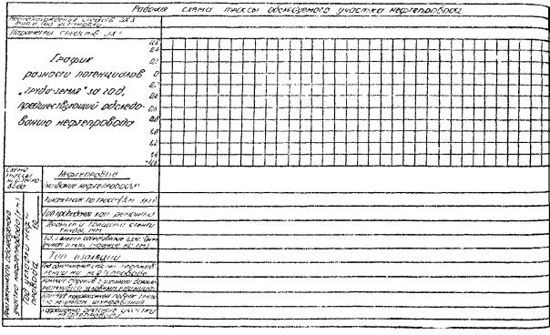 Эти участки выделены линией на рабочей схеме. Для шурфования выбираем участок с наибольшим размером дефектов в изоляции, которые также характеризуются низким сопротивлением грунта (участки I, II, III, IV, V, VI) и значением разности потенциалов «труба-земля» меньше минимально допустимого (уч-ки II, III, IV, V). Шурфование подтвердило наличие дефектов в изоляционном покрытии, явившихся результатом брака изоляционно-укладочных работ: участки I, IV, III - недохлест при изоляции; участки II, III - плохо заизолированы повороты нефтепровода, участки V, VI - сдиры при протаскивании по слегам. Коррозионные повреждения стенки трубы обнаружены на участках II, III, IV, V. Коррозия носила язвенный характер с глубиной каверн до 1,5 мм. Реальная скорость коррозии на обследуемом участке, принятая по ее максимальному значению, равна К = 1,5 мм/15 лет = 0,1 мм/год. Допустимая скорость коррозии в данном случае при предельной толщине стенки 5 мм: КД = (9 - 5) мм/50 лет =0,08 мм/год, т.е. К > КД. По результатам анализа были намечены следующие мероприятия по улучшению противокоррозионной защиты обследуемого участка нефтепровода: 1. Сооружение дополнительного электродренажа для повышения эффективности электрозащиты на участке 76 - 106 км. 2. Ликвидация дефектов в изоляционном покрытии на I, II, V, VI и VII участках. 3. Ликвидация очагов коррозии. ПРИЛОЖЕНИЕ 3ФОРМЫ ТЕХНИЧЕСКОЙ ДОКУМЕНТАЦИИПредварительная документация (составляется техническим отделом управления) Предварительная документация о состоянии изоляции и стенки трубы по результатам контрольного обследования включает карточки осмотра изоляции и стенки труб в шурфах (форма 1). Карточки осмотра, заполненные при обследовании состояния трубопровода в контрольных шурфах, должны быть пронумерованы и сброшюрованы в отдельную папку. На основании карточек осмотра составляется дефектная ведомость. Каждый шурф в дефектной ведомости должен быть привязан к километру или пикетам. На основании дефектной ведомости определяются участки, подлежащие дополнительному обследованию посредством электроизмерений и шурфования. Сведения, полученные в результате дополнительного обследования трубопровода, заносятся в карточку осмотра и служат дополнением к дефектной ведомости. Исполнительная документация (составляется исполнителем работ) При сдаче выполненных работ приемочной комиссии представляются следующие документы: а) исполнительный приемо-сдаточный акт на произведенный капитальный ремонт трубопровода (форма 3). б) выкопировка из профиля с обозначением состояния трубопровода до ремонта и характера произведенного ремонта. В выкопировке следует указать особые условия (местности, грунтов и др.), влияющие на состояние трубопровода; в) заводские сертификаты на все применяемые материалы, а в случае их отсутствия - результаты контрольных испытаний. Кроме того, к исполнительному приемо-сдаточному акту прилагаются журналы учета видов работ: а) земляных работ (форма 4); б) очистных, грунтовочных и изоляционных работ (форма 6); в) сварочных работ (форма 7). Текущая документация (составляется исполнителем работ) Основным техническим документом при ведении ремонтных работ является графический журнал работ, который заполняется ежедневно начальником или механиком ремонтно-строительного участка. В графическом журнале работ должна быть указана ситуация местн